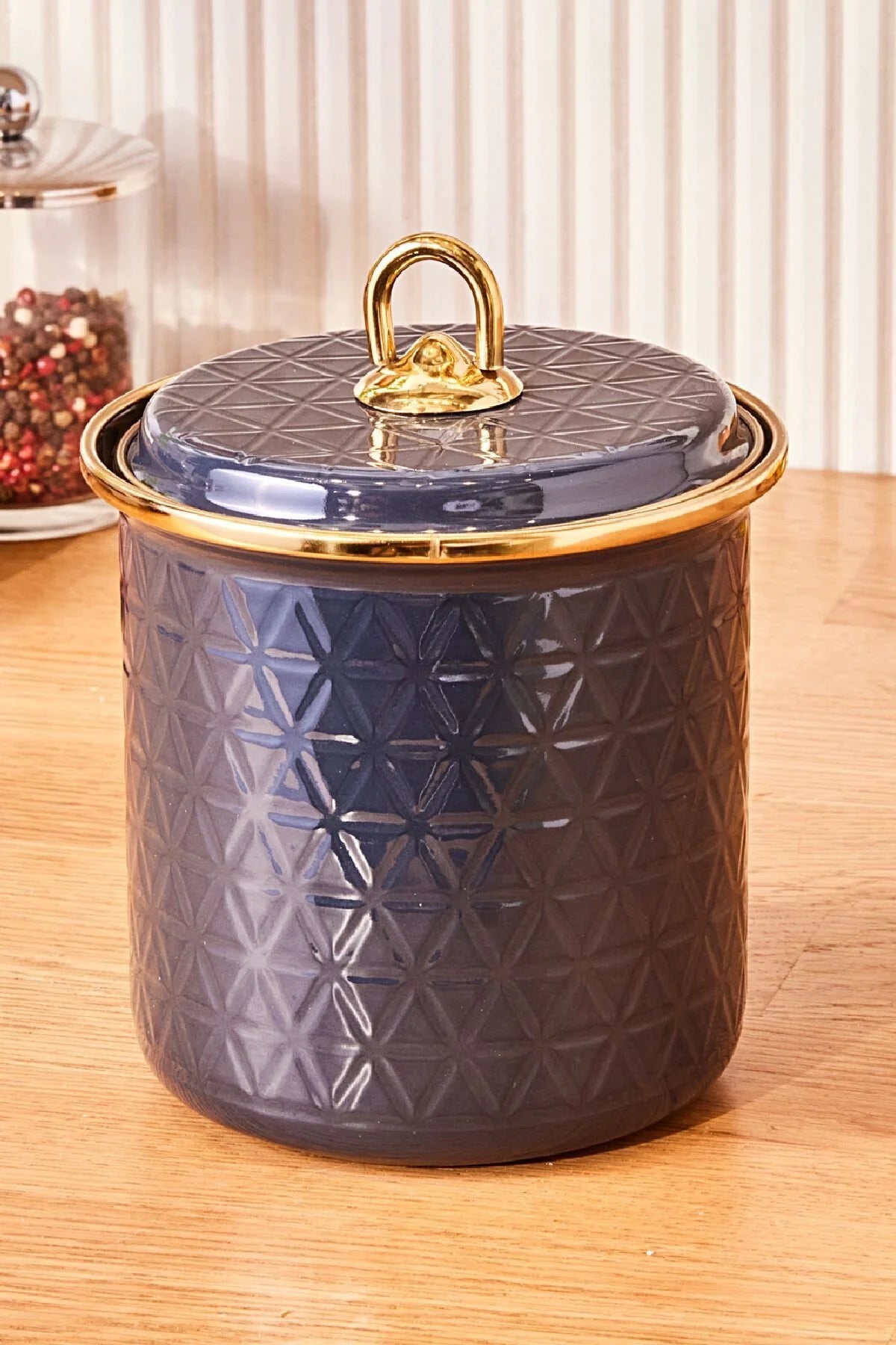 Turkish Bu premium emaye saklama kavanozuyla en değerli malzemelerinizi şık bir şekilde koruyun. Dayanıklı emaye kaplama ve güvenli kapağıyla içeriği taze tutarken, mutfağınıza veya pantolonunuza sofistike lacivert rengiyle zarafet katıyor. Kuru malzemeler, baharatlar veya özel ürünler için ideal olan bu çok yönlü kap, işlevselliği zamansız estetik çekicilikle birleştiriyor. İyi organize edilmiş herhangi bir mutfak alanının vazgeçilmez bir parçası.