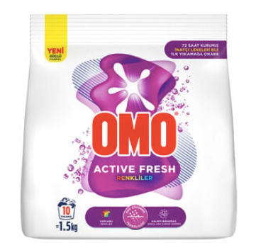 OMOMATIK TOZ DETERJAN ACTIVE RENKLILER, renkli kumaşlar için özel olarak formüle edilmiş 1,5 kg toz deterjandır. Giysilerinizin renklerini solmadan koruyarak etkili temizlik sağlar ve kumaş kalitesini muhafaza eder. Günlük kullanıma uygundur, her yıkamada lekeleri derinlemesine çıkarır ve ferahlık sunar.