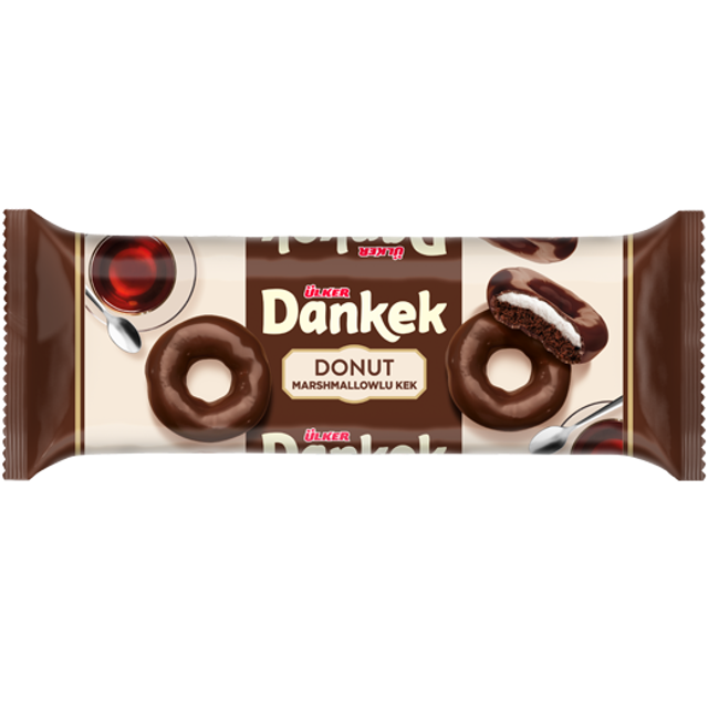 ULKER DANKEK DONUT Marshmallow Donut Keki, yumuşak ve kabarık marshmallow ile zengin donut kekinin lezzetli bir birleşimini sunar. Hafif dokusu ile tatlı bir atıştırmalık arayanlar için ideal olan bu ürün, aşırı ağır olmadan dengeli bir lezzet ve keyif sağlar.