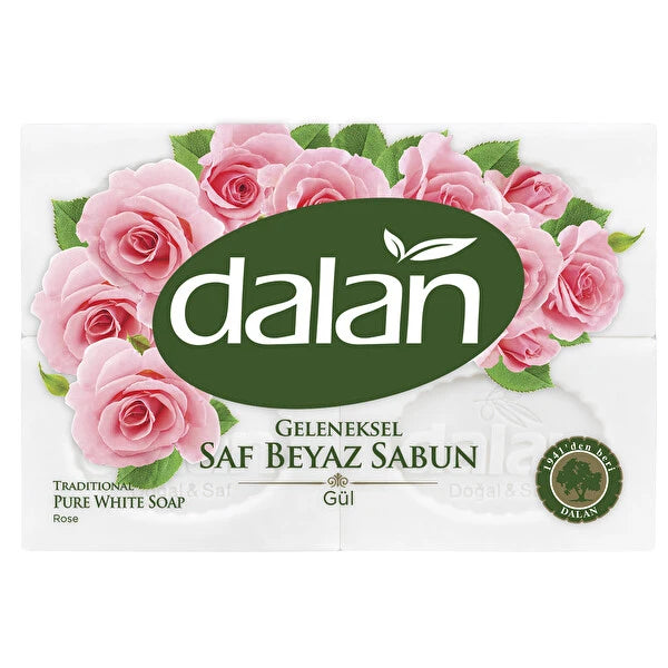 DALAN BANYO KALIP SABUN GUL Gül 150g x 4, doğal gül özleriyle cildi nazikçe temizler ve besler. Kirlerden arındırırken cildin yumuşak ve hafif kokulu kalmasını sağlar. Günlük kullanım için uygundur, cildin nem dengesini korumaya yardımcı olur.