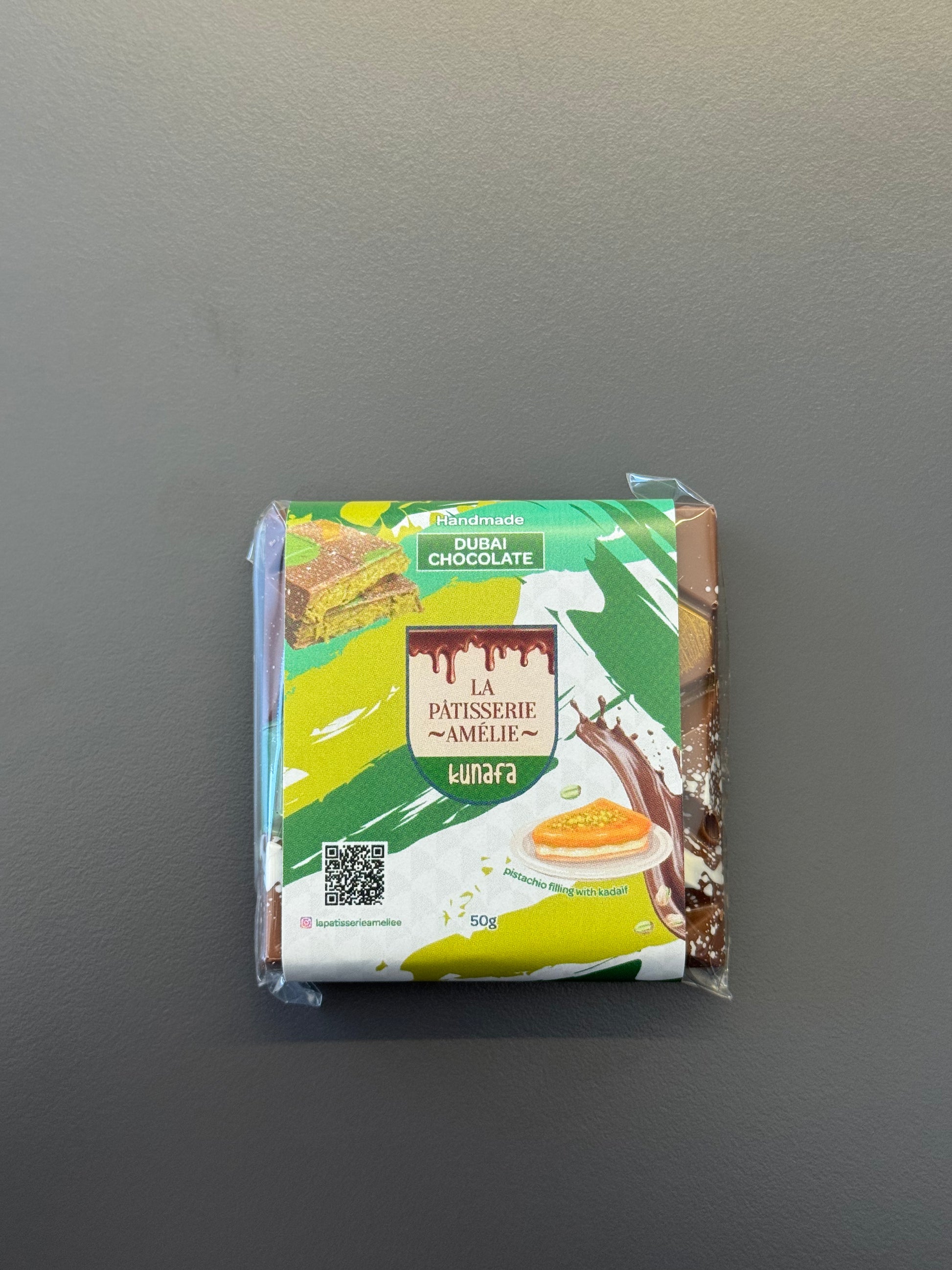 La Patisserie Amelie Dubai Chocolate 50g offers a luxurious taste experience with its rich, premium-quality chocolate. Crafted with carefully selected ingredients, this chocolate delivers a smooth texture and intense flavor, perfect for discerning chocolate lovers seeking a refined treat.